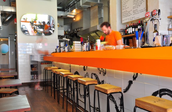 There's little to the design beyond wipe-clean orange surfaces and a central bar behind which the chefs work, plus a smattering of small tables and stools around the sides. The focus is firmly on the food - and what food. Andalusian-style ajo blanco, made with fine-ground almonds and spiked with sherry vinegar, was silky smooth, served Malaga-style with a few sweet muscat grapes. The richness of chicharrones made from slow-cooked pork belly that is then cooked until crisp on the plancha grillwas cut with cumin and lemon.