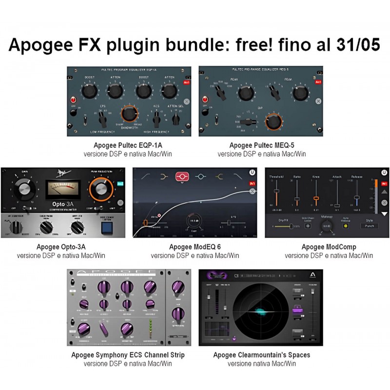 PROMO valida fino al 30/11/24: Symphony Desktop + Apogee FX plugin bundle a euro 1,259! Ottieni suite di plugin comprensiva di Apogee Pultec EQP-1A; Apogee Pultec MEQ-5; Apogee Opto-3A; Apogee ModEQ 6; Apogee ModComp; Apogee Symphony ECS Channel Strip; Apogee Clearmountain's Spaces