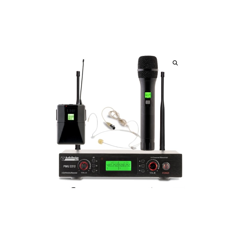 Sistema wireless UHF con un microfono palmare e un microfono ad archetto.