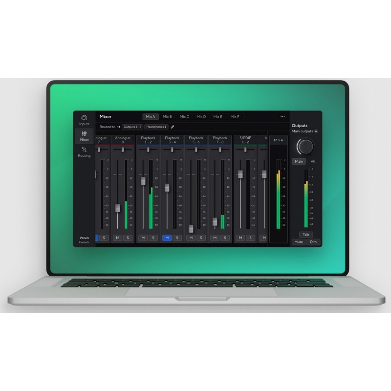Scarlett 18i16 è alimentata direttamente tramite la porta USB-C (3A) del computer, senza necessità di alimentazione esterna. Con Focusrite Control 2, puoi facilmente gestire la tua interfaccia audio da qualsiasi punto del tuo studio, sia su desktop (Windows/macOS) che tramite dispositivi mobili (iOS/Android).