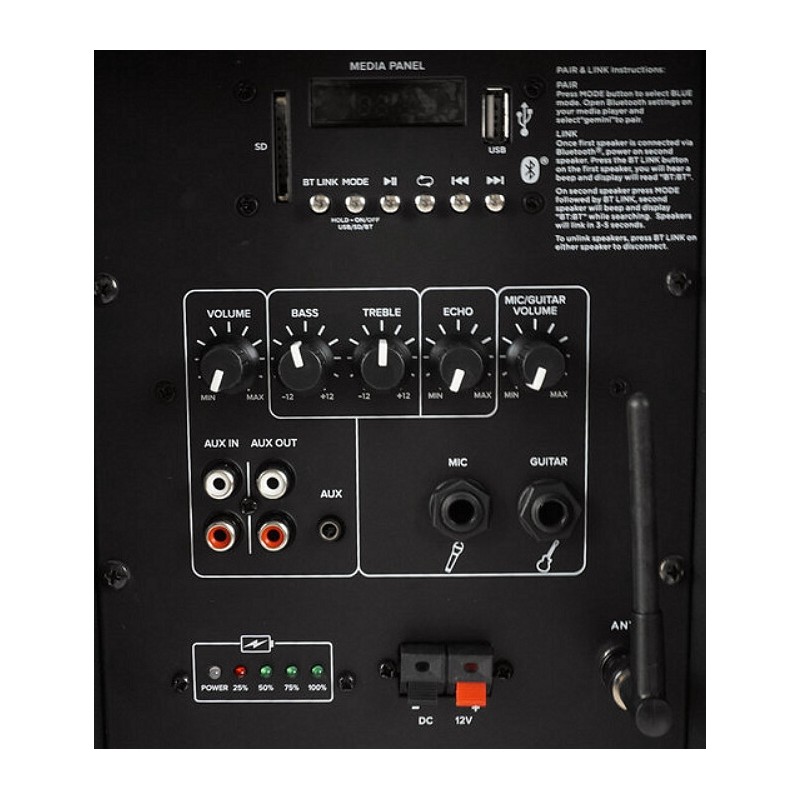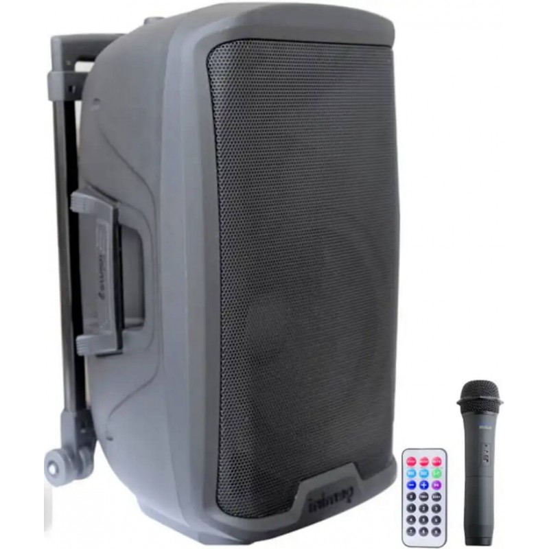 Questo diffusore amplificato portatile può essere alimentato sia a corrente di rete (220V) sia a batteria (12V). Dotato di radiomicrofono UHF 863-865 MHz, dispone di ricevitore Bluetooth per collegare qualunque sorgente esterna senza ricorrere a cavi in modalità wireless, di un lettore USB ed SD Card con le funzioni Play/Pause/FFWW/Rew oltre allo Skip della traccia ed al Random Play.