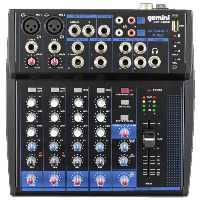 GEM-08USB è il mixer Gemini perfetto per molteplici situazioni, dal podcasting, alla conferenza, al set live. Dotato di streaming Bluetooth, riproduzione da chiavetta USB, presenta tutte le connessioni di un classico mixer a 8 canali /2 bus, con controlli e feature standard: EQ a 3 bande sui canli microfonici e 2 bande sui canali di linea, alimentazione phantom + 48 V per i microfoni a condensatore, impostazioni di trim e pan su ciascun canale, effetto di echo e delay on-board e mandata/ritorno per effetti esterni.