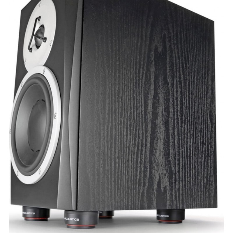Gli ISO-Puck mini di IsoAcoustics forniscono un approccio innovativo nell'isolamento dei monitor da studio e di altri sistemi. Il loro design unico fornisce un altissimo grado di isolamento impedendo i movimenti e le oscillazioni laterali, che si traduce in un'estrema limpidezza sonora ed in una superba precisione nella riproduzione del suono. Sono il più versatile strumento di isolamento attualmente disponibile sul mercato per lo studio o per la casa, potendo essere collocati dovunque sia necessario un miglioramento delle prestazioni delle vostre attrezzature e dei vostri monitor. Il design a "ventosa" della flangia superiore dell'ISO-Puck mini aderisce alla parte inferiore del cabinet, facendo vivere la parte superiore dell'isolatore con l'altoparlante, mentre la parte inferiore si fissa alla superficie di appoggio. Tutta l'energia viene gestita all'interno del nucleo degli ISO-Puck mini, accuratamente ottimizzati per fornire isolamento e controllo superiori rimanendo in asse. Questi isolatori disaccoppiano i monitor e gli altoparlanti dalla superficie di supporto per eliminare il trasferimento di energia e le conseguenti sbavature e colorazioni del suono.