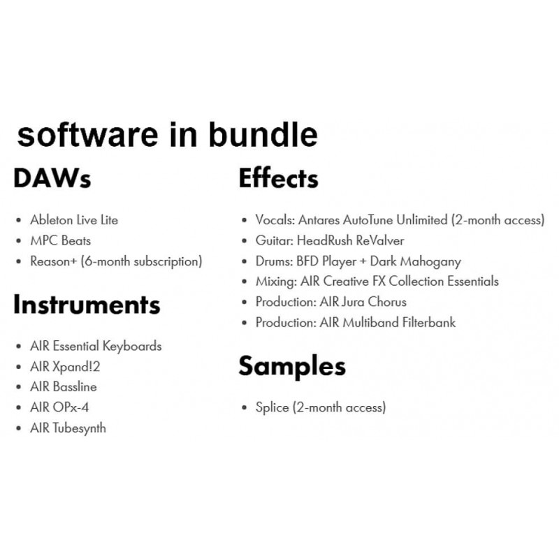Con un pacchetto software completo che include nomi di spicco come Ableton, MPC Beats, e AutoTune, potete tuffarvi nella produzione musicale o nella creazione di contenuti senza delay. Questo pacchetto elimina le congetture e vi aiuta a iniziare a creare con fiducia.