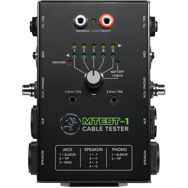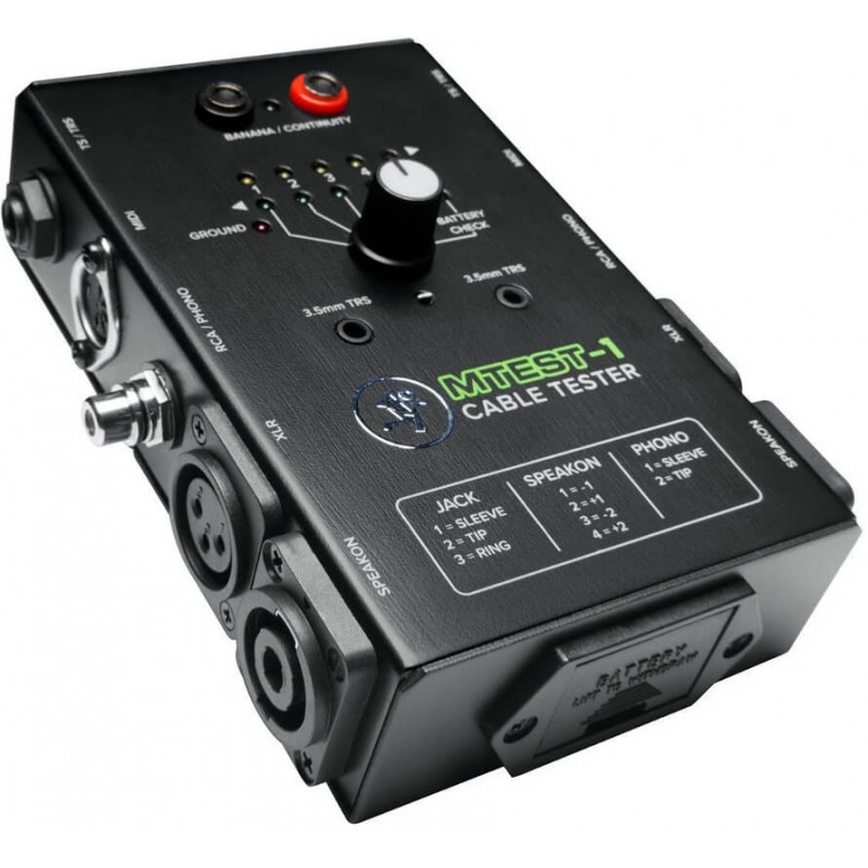 Dotato di un semplice selettore a 5 vie per testare ogni pin, anche con connettori non corrispondenti, l' MTEST-1 alimentato a batteria è uno strumento essenziale da avere nella tua borsa per ogni concerto. È anche possibile testare manualmente la continuità tra due punti qualsiasi con le sonde incluse. Dotato dei più comuni tipi di connettori, tra cui TRS, TS, XLR, RCA, Speakon, jack TRS da 3,5 mm, MIDI ed a Banana. Che tu abbia pochi cavi o una montagna, vale la pena di sapere quali sono buoni e quali devono essere messi nel cumulo dei "non abbastanza buoni". L'MTEST-1 è uno strumento incredibilmente utile per estirpare i cavi che potrebbero aver visto troppi concerti.