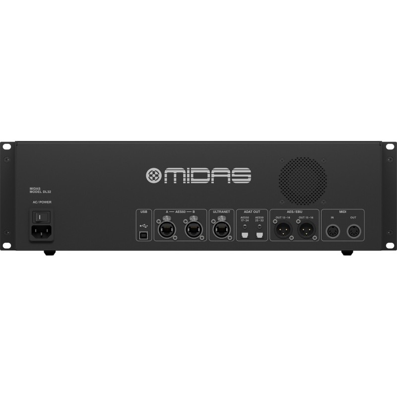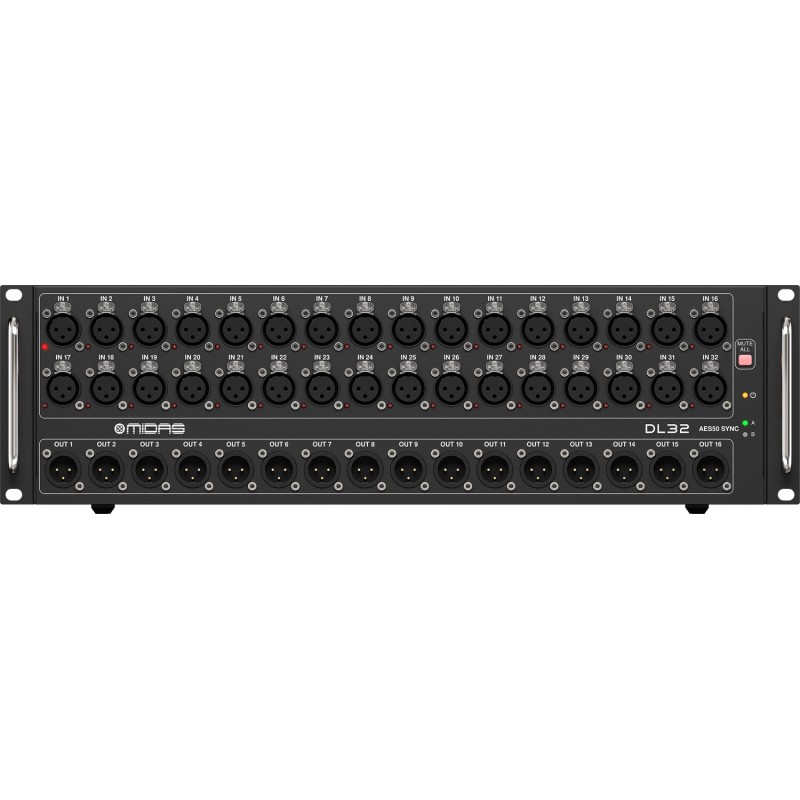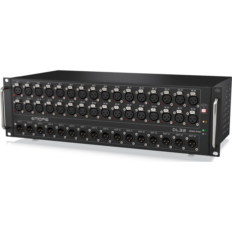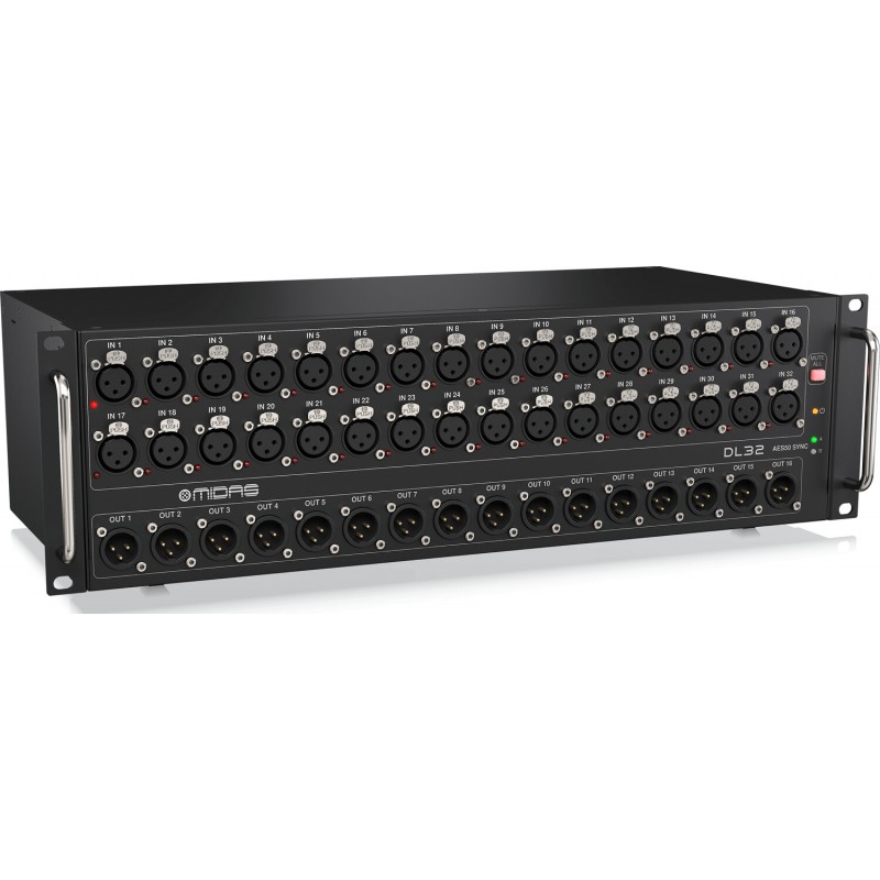Il mixaggio digitale ha rivoluzionato completamente il flusso di lavoro della produzione di intrattenimento sonoro dal vivo. Midas DL32 è la soluzione perfetta pensata per collegare il palco con la console Front of House (FOH) trasformandolo in un palco digitale ricco di I/O in un formato compatto ed efficiente. Midas DL32 è dotato di 32 preamplificatori microfonici remotabili Midas PRO Series, oltre che di 16 ritorni XLR analogici bilanciati, il tutto comodamente connesso tramite un singolo cavo LAN Cat 5e. Quando utilizzate come parte di un sistema M32 completo, due Stage Box DL32 possono essere collegate in cascata tramite le porte AES50 integrate, fornendo connettività per un massimo di 64 ingressi microfono/linea, 32 uscite bilanciate; tramite porta ULTRANET è possibile inoltre il collegamento diretto agli altoparlanti della serie Turbosound iQ e al sistema di monitoraggio personale Behringer POWERPLAY P-16, in grado di pilotare fino a 48 mixer monitor individuali. Completano la dotazione di Midas DL32 la presenza di 2 porte ottiche ADAT e AES-3 (AES/EBU) per il collegamento a dispositivi esterni, una comoda porta USB per gli aggiornamenti del sistema tramite computer, I/O MIDI per i sistemi di illuminazione e il controllo di moduli sonori.
