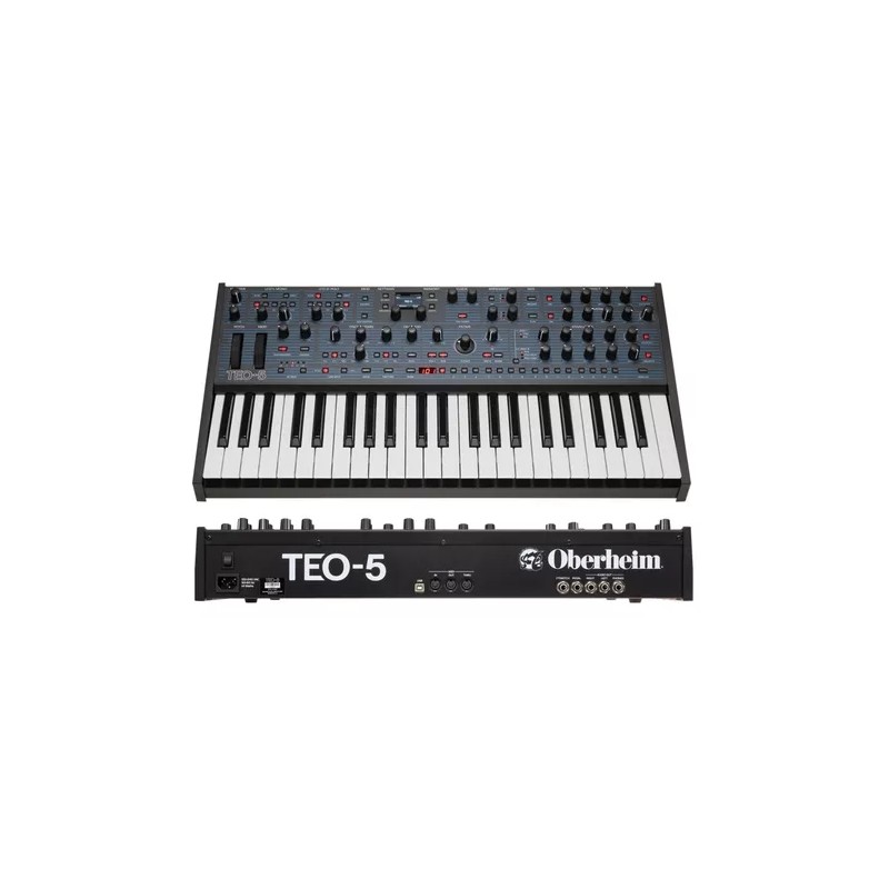 Oberheim TEO 5 è uno strumento moderno, un synth analogico polifonico a 5 voci (2 VCO, sub osc per voce) con X-Mod (FM) equipaggiato di una tastiera Fatar Premium semi-pesata a 3,5 ottave (44 tasti), sensibile a velocity e aftertouch. Il filtro è un SEM a stato variabile (lowpass, highpass, notch e bandpass). Ricca e articolata è la matrice di modulazione. 2 sono i processori di effetti digitali a 24-bit/48kHz: uno dedicato esclusivamente al riverbero (room, hall, plate, spring) e un altro ad effetti quali delay, chorus, flanger, emulazioni degli Oberheim phase shifter e ring modulator. Overdrive Stereo analogico. 2 LFO, 2 ADSR assegnabili. Arpeggiatore e Sequencer polifonico a 64-Step con legature e pause.
