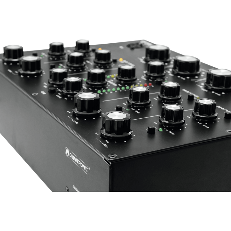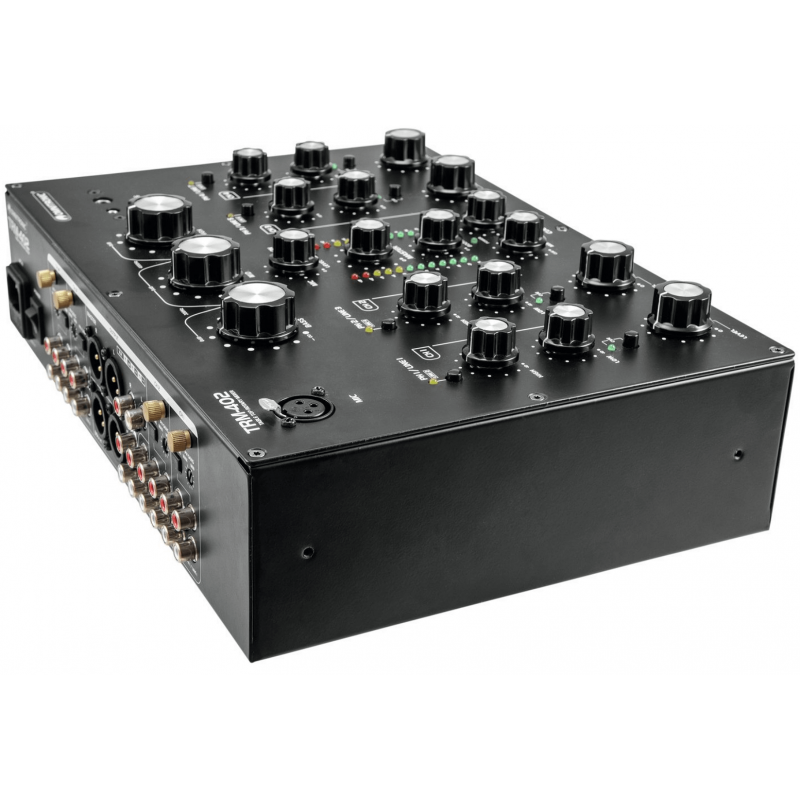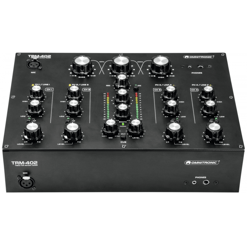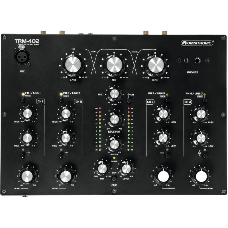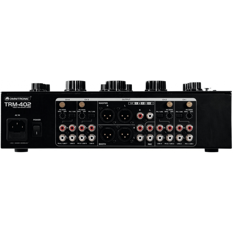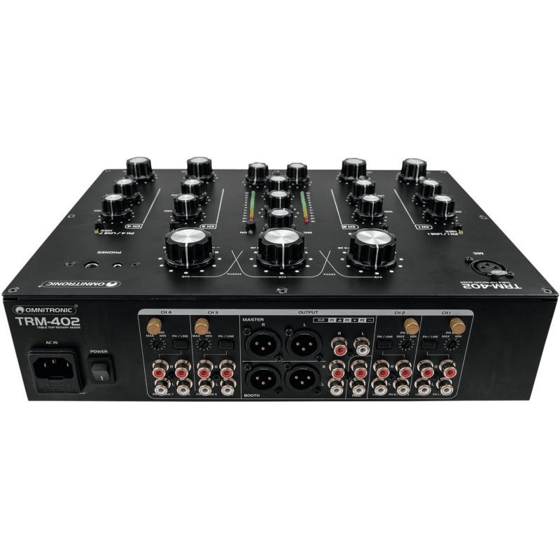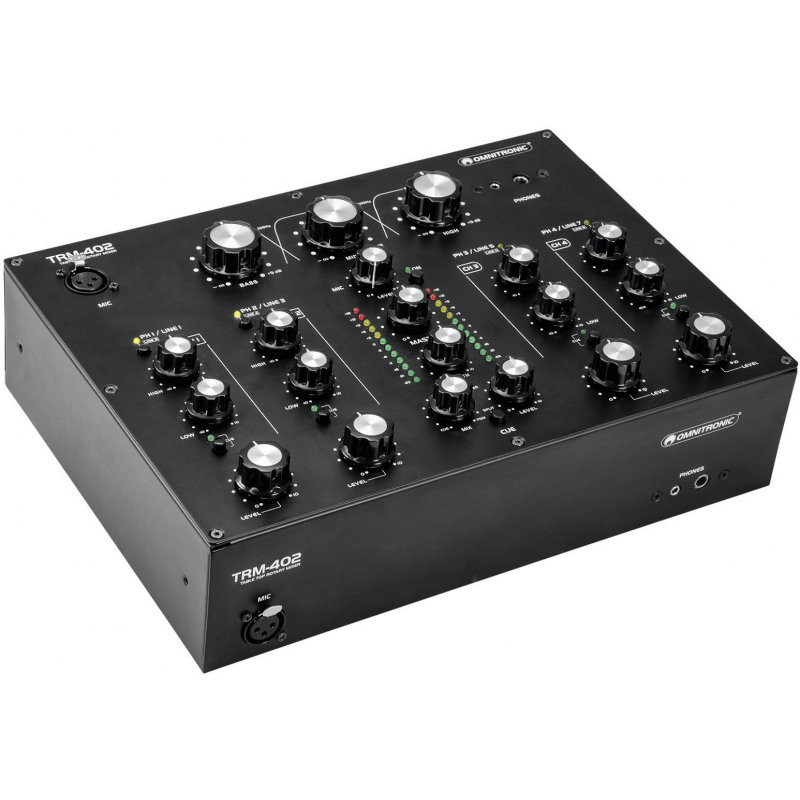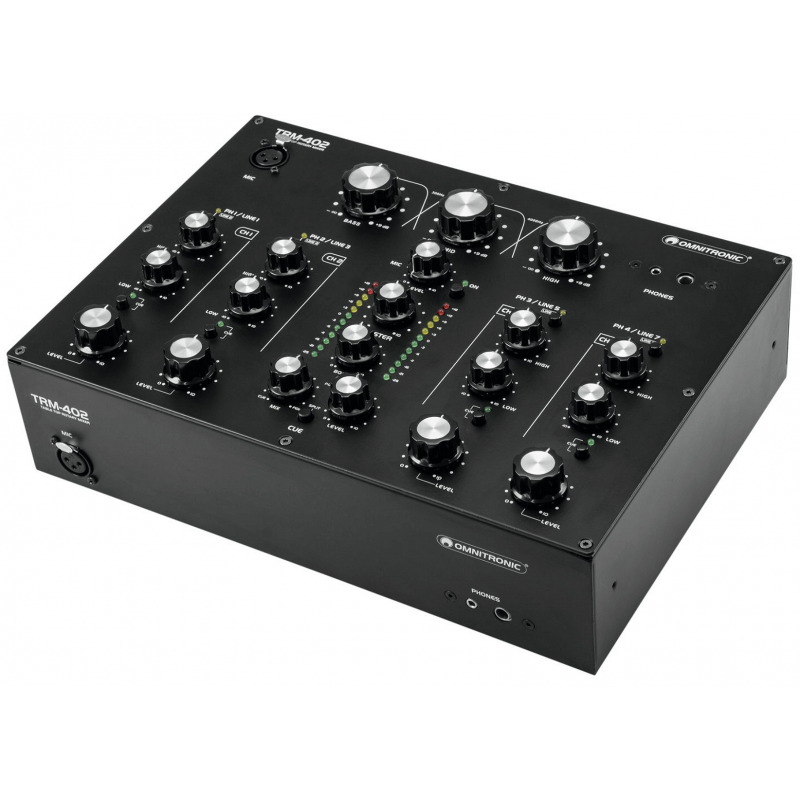 L'Omnitronic TRM-402 è un mixer analogico a 4 canali con EQ isolatore a 3 bande. E' dotato di controllo del gain, equalizzatore a 2 vie (alti/bassi) e commutazione phono/line per ciascun canale, Boost dedicato e Kill Cut. La funzione Kill Cut consente ai DJ di rimuovere completamente le frequenze basse, medie e alte per un mixaggio sorprendente. E' dotato di una grande connettività con 8 ingressi di Linea e 4 Phono (RCA L/R), usicte master e stand (XLR/RCA L/R) e registrazione (stereo RCA), oltre ad un doppio ingresso per microfono DJ (con controlli di livello e cuffie separati) sul pannello superiore e anteriore , e ad un'uscita Boot con controllo del livello separato.