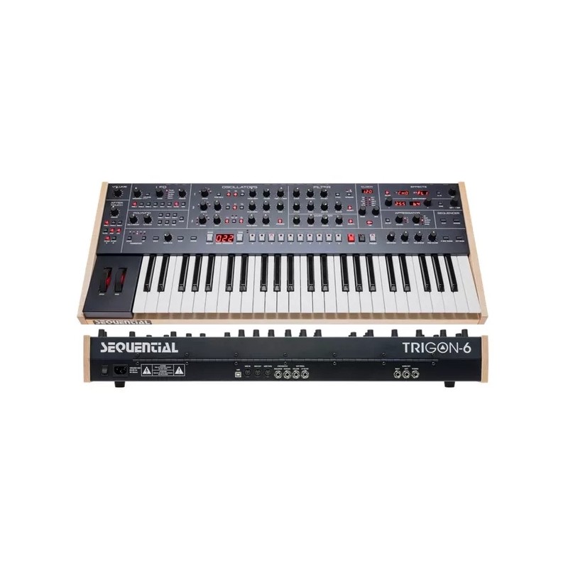 Il motore sonoro analogico del Sequential Trigon 6 si presenta all'interno di una tastiera a 4 ottave sensibile alla velocity e all'aftertouch, con arpeggiatore e sequencer a 64 step polifonico. I 3 VCO offrono forme d'onda triangle, saw e pulse all'occorrenza attivabili tutte in contemporanea. Presente anche un generatore di rumore bianco. Il filtro ladder è configurabile a 2 o 4 poli. 2 sono gli ADSR (filtro e amplificatore), tra le varie possibilità di modulazione si segnalano inoltre LFO e Poly Mod. Sul fronte degli effetti, Trigon 6 ci propone un distorsore stereo analogico, due processori digitali 24-bit/48kHz con effetti di riverbero, delay, chorus, flanger, phase shifter e ring modulator. 500 sono i factory preset, 500 quelli user.