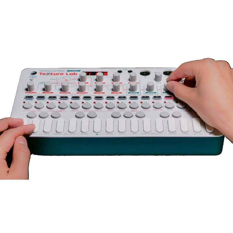LIVEN Texture Lab è un sintetizzatore polifonico a 4 voci in grado di registrare ben 32 campioni fino a 6 secondi, generare granuli da qualsiasi parte di un campione e sintetizzarli utilizzando due sorgenti di modulazione, un generatore di inviluppo ed elaborare il suono attraverso diversi tipi di filtri; campionamento, slicing, editing e re-editing dell'audio per sintetizzare suoni completamente nuovi: ecco cosa può offrire Sonicware Liven Texture Lab, con un'ampia varietà di texture sonore, dai pad ambient lussureggianti, ai rumori sperimentali caotici e aggressivi, sempre verso nuove frontiere sonore. Texture Lab utilizza infatti un processore granulare che frammenta i suoni in granuli di lunghezza variabile da 2 ms a 1 secondo, per poi trasformarli e ricomporli in vari modi: manipolazione della forma d'onda, della densità, della distorsione, della posizione spaziale e del metodo di riproduzione dei granuli, e ottenere sempre suoni completamente nuovi; tutti i parametri di sintesi granulare sono facilmente accessibili tramite 10 manopole e sono progettati per un controllo intuitivo.