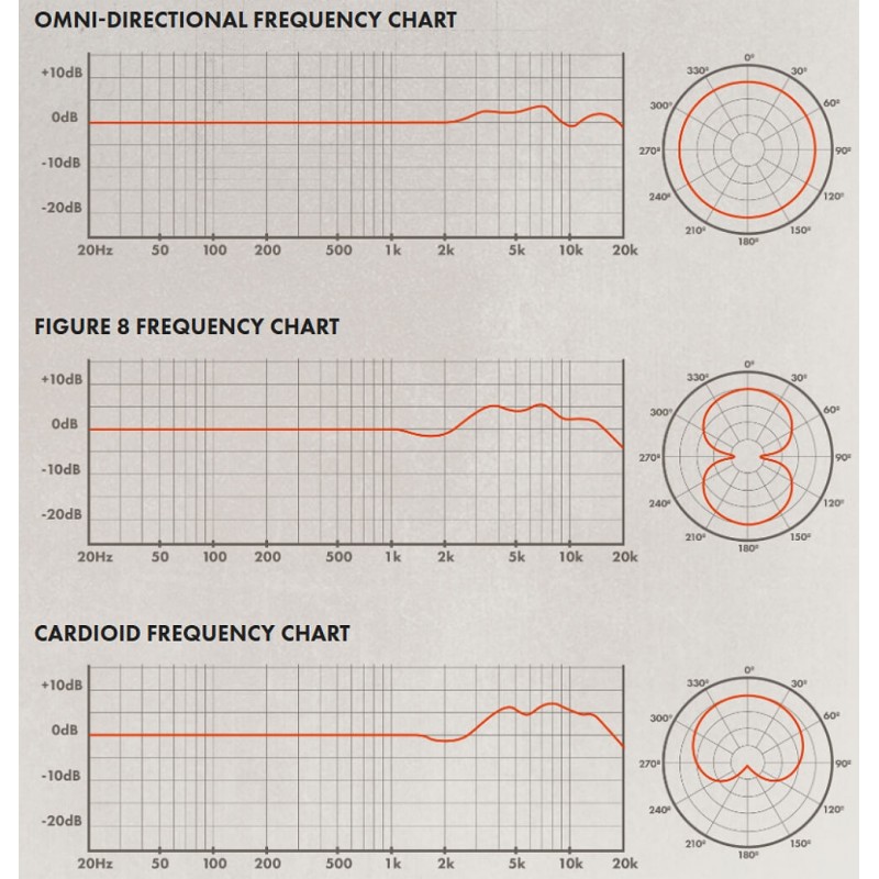 Diagrammi polari: 9 diagrammi: cardioide, omnidirezionale, figura a 8, + 6 diagrammi misti aggiuntivi (accessibili tramite due interruttori, uno per capsula)